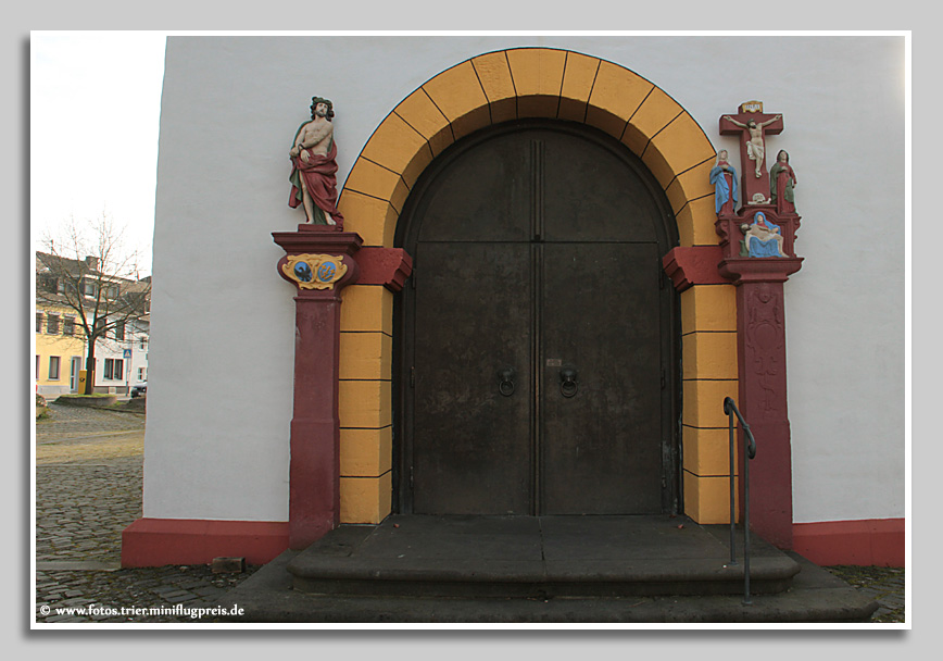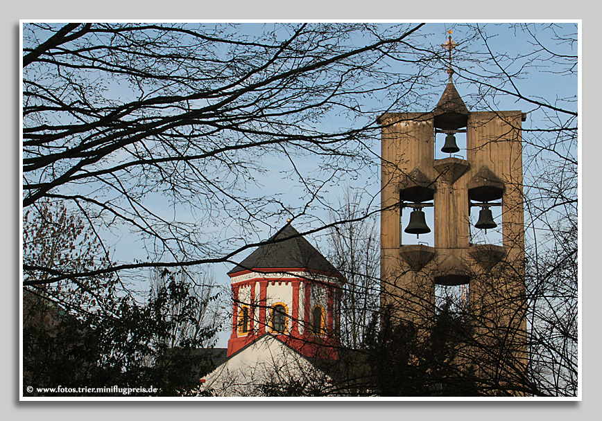 Bronzebrunnen von Klaus Apel mit stilisierten Heiligkreuzer Sehenswürdigkeiten auf dem Kirchplatz in Trier-Heiligkreuz